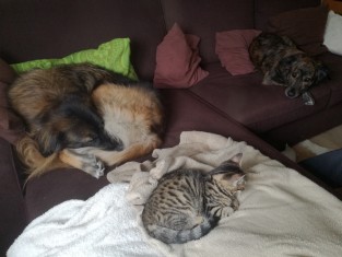 Mijn man en ik wonen samen met Charly & Mila, onze geweldige honden, en Matilda, onze betoverend wilde poezendame. Alle drie staan ze altijd klaar met water in de mond als er "munchies" zijn.